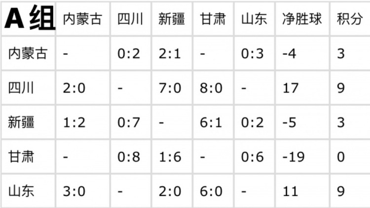 目前,四川和山東同積9分,憑借出色的表現(xiàn)已提前鎖定出線資格。在凈勝球方面,四川以17個(gè)凈勝球領(lǐng)先,山東凈勝球?yàn)?1個(gè)。內(nèi)蒙古和新疆均積3分,甘肅積0分已確定無緣出線。最后一輪比賽,雖無直接影響出線的關(guān)鍵對決,但各隊(duì)仍會(huì)為榮譽(yù)而戰(zhàn),力求以更好的成績結(jié)束資格賽階段。