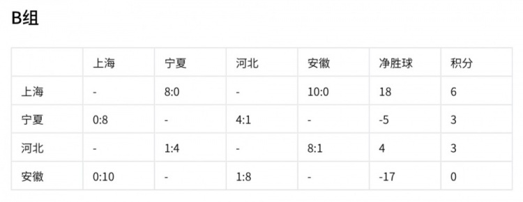 上海隊(duì)以6分、18個(gè)凈勝球的優(yōu)勢提前出線。寧夏和河北同積3分,寧夏凈勝球?yàn)?-5,河北凈勝球?yàn)?,安徽積0分已出局。最后一輪比賽,各隊(duì)的表現(xiàn)將決定最終排名,寧夏和河北都渴望在最后一戰(zhàn)中爭取更好名次。