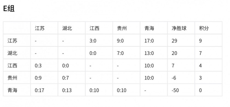 江蘇隊(duì)以9分和29個(gè)凈勝球的絕對優(yōu)勢提前出線。湖北積7分、凈勝球20個(gè),出線形勢大好;江西積4分、凈勝球7個(gè),仍有出線機(jī)會(huì);貴州積3分、凈勝球 -6,青海積0分、凈勝球 -50已出局。最后一輪比賽,各隊(duì)之間的競爭將決定剩余出線名額的歸屬,比賽結(jié)果充滿懸念。