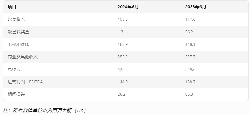 -比賽日收入1.058億英鎊(2023年:1.176億英鎊),主要由于本年度主場(chǎng)比賽場(chǎng)次比去年減少9場(chǎng)