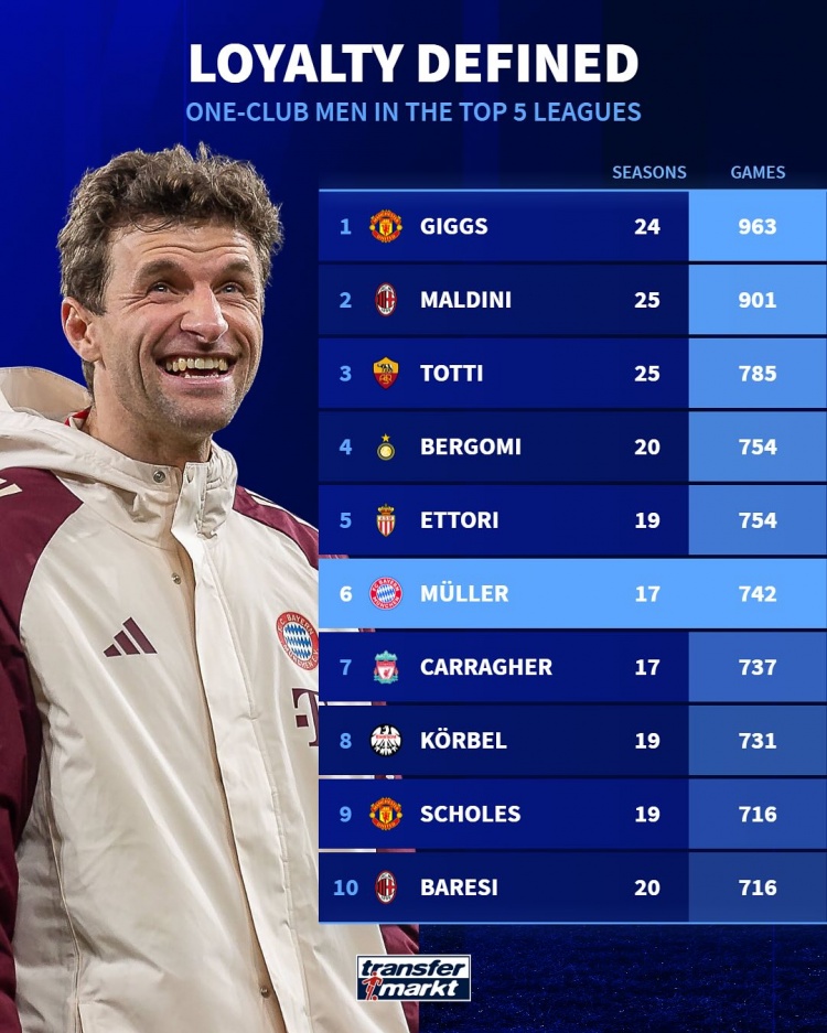 4月1日訊 德國(guó)轉(zhuǎn)會(huì)市場(chǎng)統(tǒng)計(jì)了五大聯(lián)賽歷史一人一城球員的出場(chǎng)次數(shù),并列出榜單,吉格斯、馬爾蒂尼、托蒂位居前三,穆勒排名第6位。