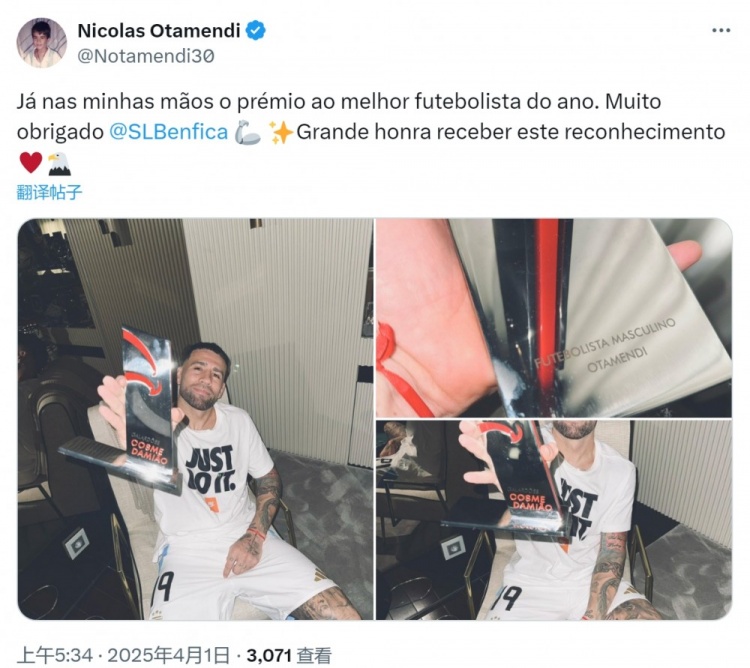 - 37歲奧塔門迪當(dāng)選本菲卡年度最佳球員,社媒曬手拿獎(jiǎng)杯照片