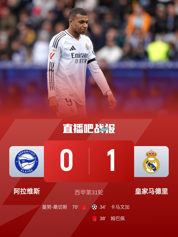 卡馬文加世界波迎聯(lián)賽首球,姆巴佩兇狠蹬踏對(duì)手小腿被直紅罰下,最終十人皇馬客場(chǎng)1-0戰(zhàn)勝十人阿拉維斯。