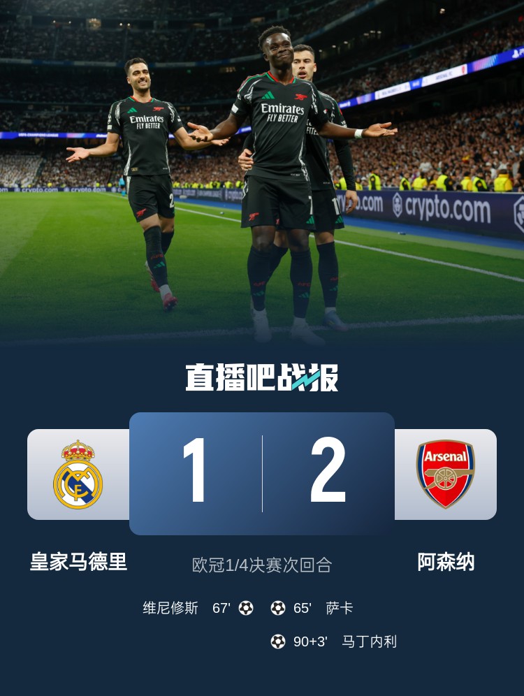 歐冠1/4決賽次回合,阿森納客場2-1皇馬,總比分5-1晉級四強(qiáng),薩卡、馬丁內(nèi)利進(jìn)球。
