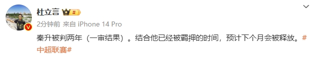 媒體人杜立言消息,秦升被判兩年(一審結(jié)果)。結(jié)合他已經(jīng)被羈押的時間,預(yù)計下個月會被釋放。